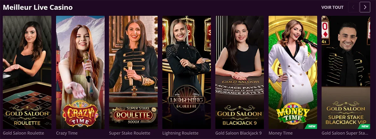 Les jeux en direct incluent la roulette française, le blackjack live, et le baccarat squeeze. Nos croupiers interagissent directement avec vous via le chat en temps réel.
